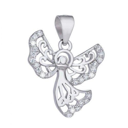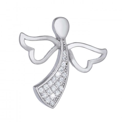 Krásný stříbrný přívěsek andělíček se srdíčkem a svatozáří, ozdobený třpytivými bílými zirkony. Na délku měří 16 mm bez poutka a očka. Přívěsek je vhodný pro všechny typy základních řetízků. Je rovněž antialergenní a rhodiovaný, tj. povrchová úprava šperku, díky níž se krásně leskne a je lépe chráněn proti přirozenému černání. Dárková krabička je součástí produktu.
